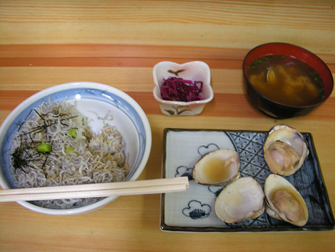 しらす丼と焼きはまぐりを注文。