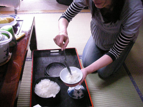友達ににご飯よそってもらっちゃったー