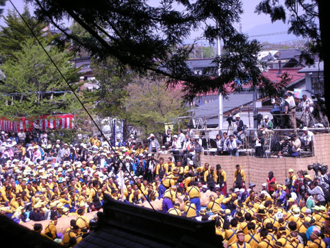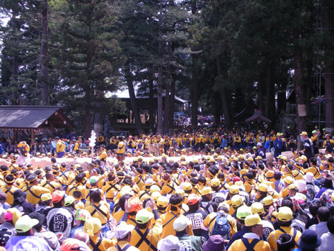 御柱のそばの氏子も、みこしも、籠も、警官も(笑)
